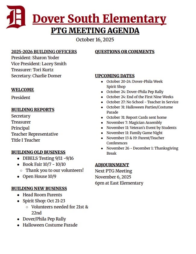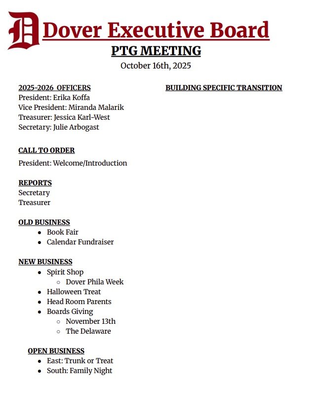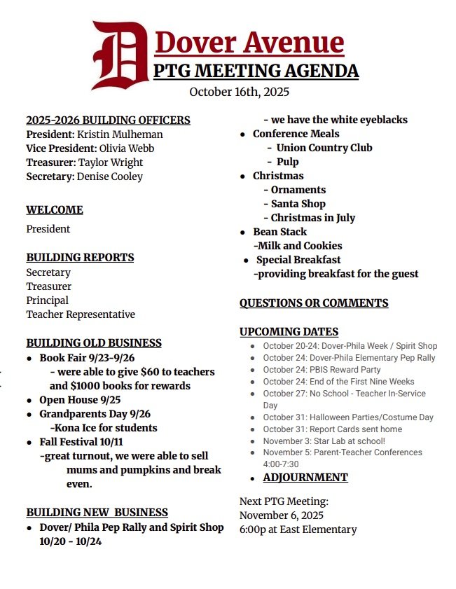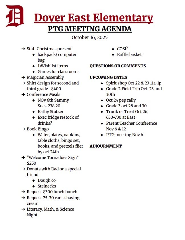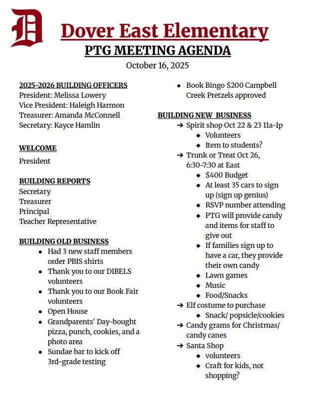 Find all the meeting agendas for each PTG board in one place. Join us for our next meeting: Thursday, October 16th at 6 PM East Elementary Library